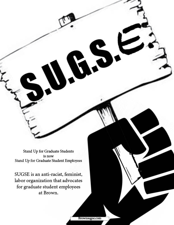 Stand Up for Graduate Student Employees is an anti-racist, feminist, labor organization that advocates for grad worker rights and protections at Brown University. We got our start in spring 2014, when the Dissertation Completion Proposal process was grossly mishandled. Graduate students roared to life in protests outside the President’s house, wore red to work-ins at the Campus Center, and pinned on “5+” buttons at graduation, where the numbers pinned to our gowns made visible the real-life amount of time and funding it takes us, and took our mentors, to obtain Ph.Ds.