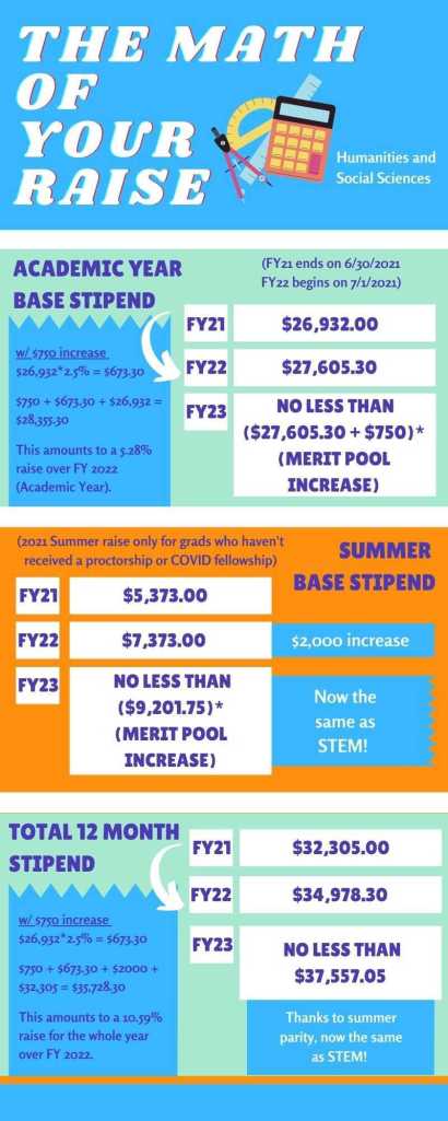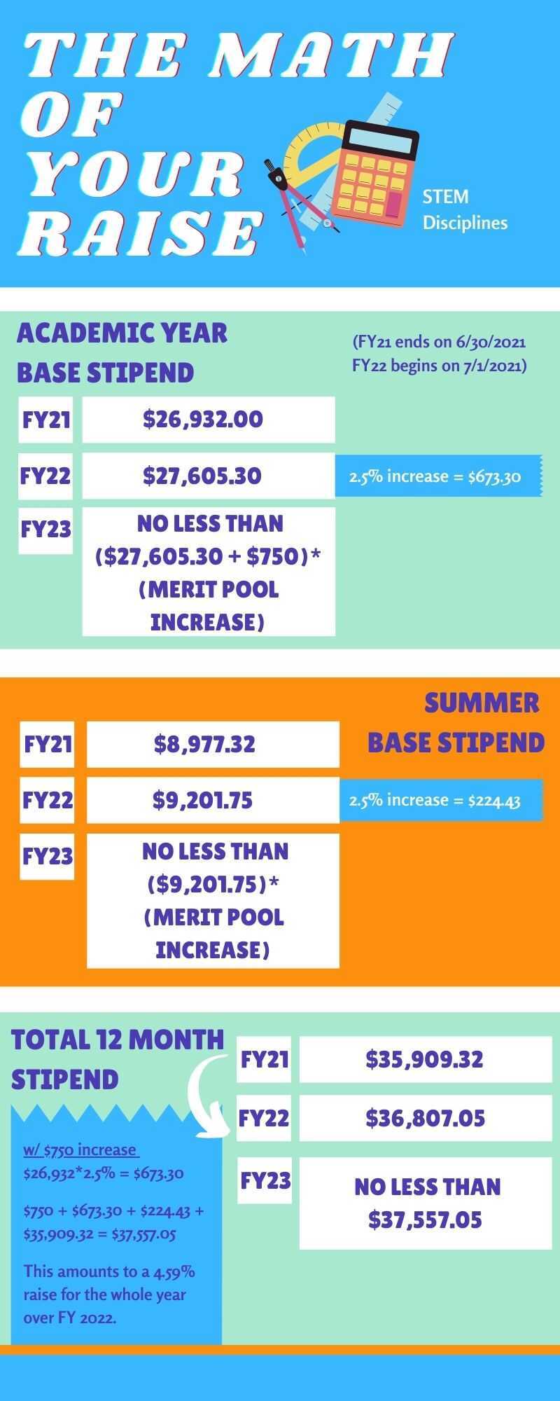 Total 12 Month Stipend FY21: $32,305.00 FY22: $34,978.30 FY23: No less than $37,557.05 <- Thanks to summer parity, now the same as STEM! with $750 increase: $26,932*2.5% = $673.30 $750 + $673.30 + $2000 + $32,305.00 = $35,728.30 This amounts to a 10.59% raise for the whole year FY2022.