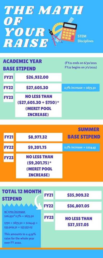 Image Text: The Math of Your Raise, STEM Disciplines Academic Year Base Stipend (FY21 ends on 6/30/2021, FY22 begins on 7/1/2021) FY21: $26,932.00 FY22: $27,650.30 <- 2.5% increase = $673.30 FY23: No less than ($27,605.30+$750)*(merit pool increase)