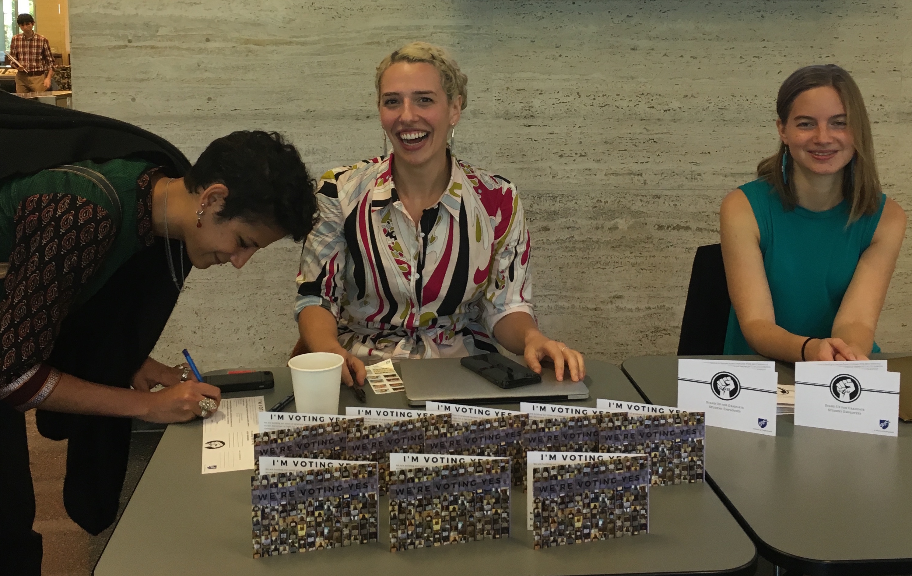 To become a Member you need to sign a Union card and pay dues. You can find a digital union card here! Before or after you sign your card, we strongly recommend prospective members have an onboarding/organizing conversation with an organizer to answer any questions you may have and share about our union’s ongoing projects. Email gradlabororg@gmail.com if you’d like to speak with an organizer!.